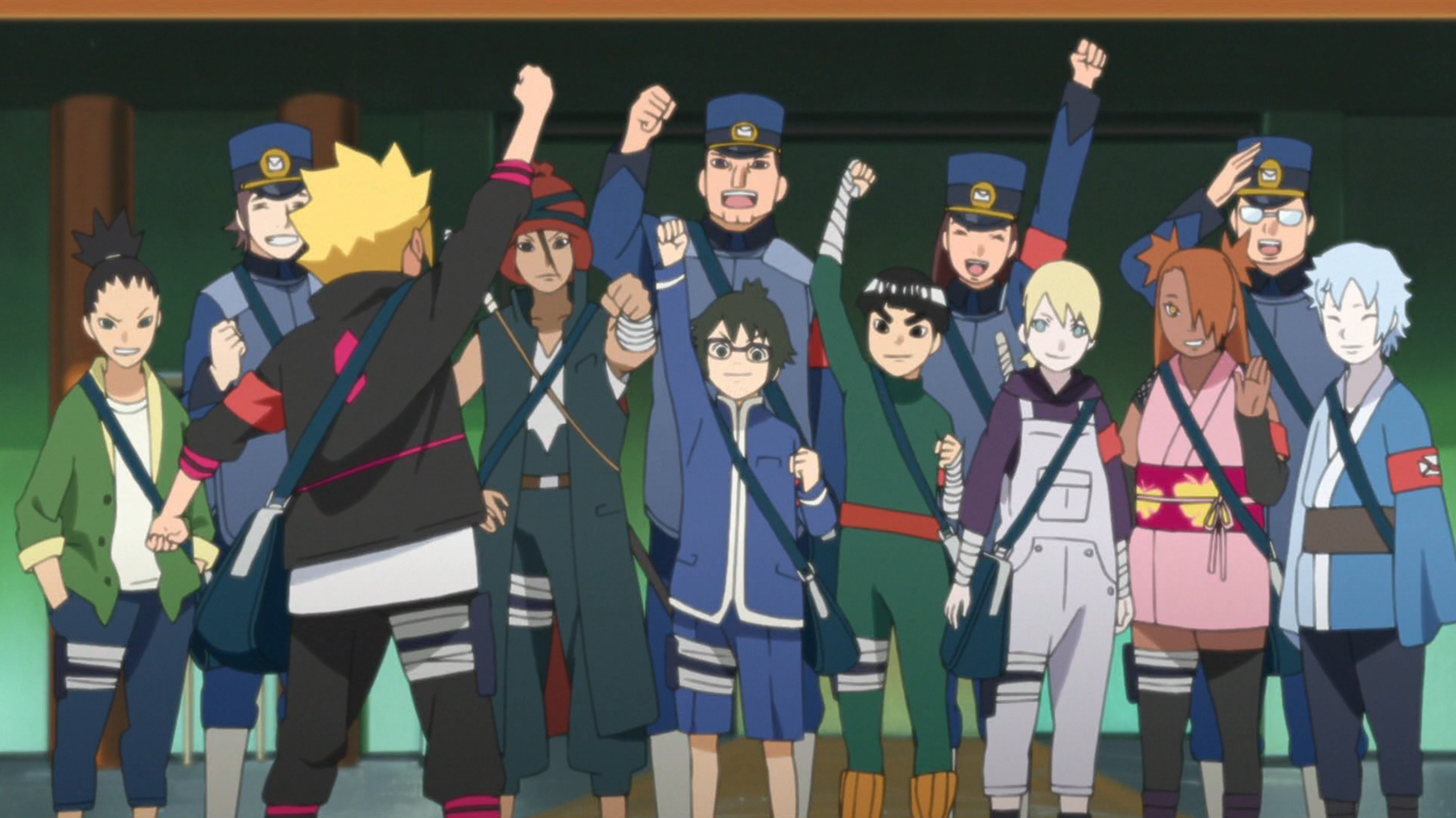 Naruto left the village on a mission shortly afterward. Boruto is sent by his mother to see Naruto off and deliver lunch to him, but when he arrived, he found that Naruto had already left. Annoyed, Boruto decided to go home despite Mitsuki's observation that they could still catch up to Naruto. At this suggestion, Sarada and Chōchō Akimichi suddenly appeared and offered to deliver the lunch for him; Boruto reluctantly agreed. When they finally returned, Boruto thanked Sarada for what she did. She insisted that she should be thanking him, as she got a lot out of the experience and now decided that she wanted to be Hokage; Boruto, however, scoffed at the idea. Upon graduating the Academy, Boruto, Mitsuki and Sarada were placed on a team under the leadership of Konohamaru.