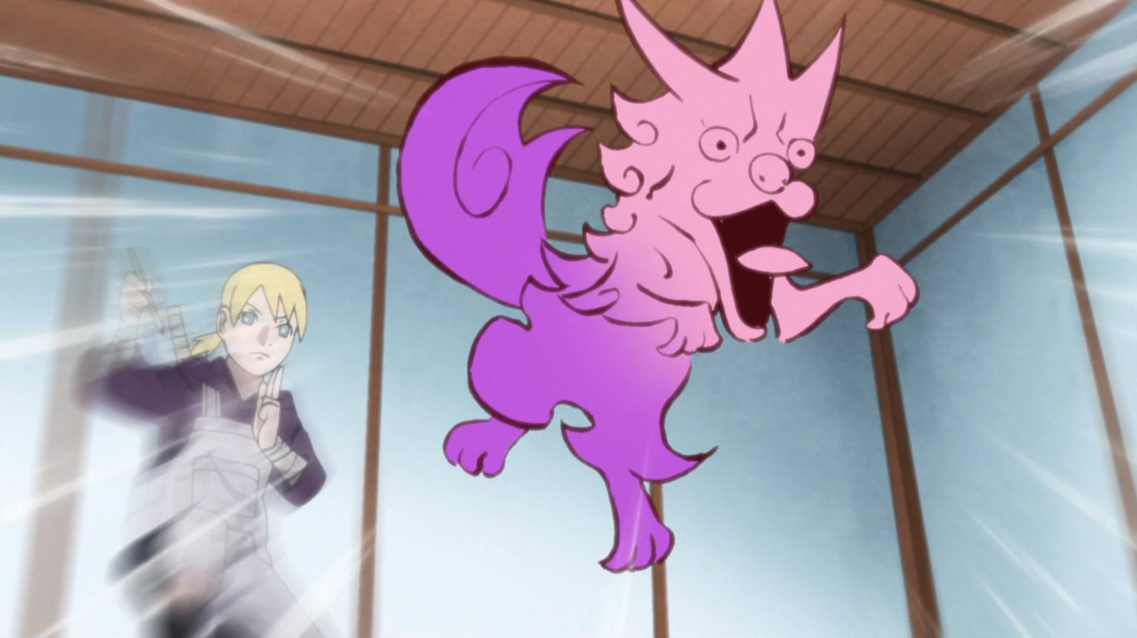 During a lesson about summoning techniques, Inojin and other boys began bickering with the girls, which Konohamaru broke up. Later during their lunch break, Boruto began to fight with Sarada over who would get the last yakisoba bun. Shino appeared, insisting that they boys and girls settle things with a race challenge for a flag. The challenge quickly got heated, with many of the boys being taken out of the contest until only Boruto, Shikidai, and Inojin were left on their team. Getting desperate, Boruto found a summoning scroll and miraculously summoned a snake-like creature. The creature went on a rampage, attacking the students and launched Chōchō Akimichi off the roof, to which Inojin helped Boruto to save her. After the creature was subdued by the timely arrival of Konohamaru, the contest ended with the girls getting the flag. Despite their victory, the girls made peace with the boys.