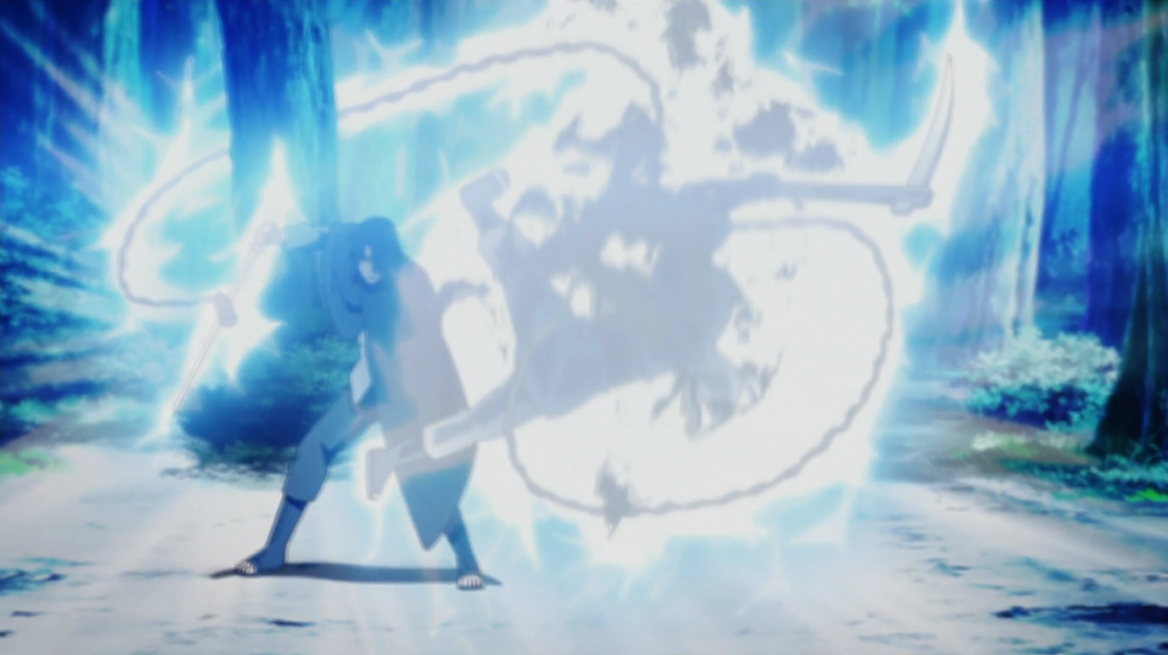 Sasuke's other natural affinity is Lightning Release, then he learns from Kakashi. While effective at piercing most targets, the standard Chidori is a very close-range attack. For this reason, Sasuke uses the principles of Chidori to create several long-range jutsu in Part II, such as throwable needles, extendable swords, and scattershot streams. He often channels his lightning chakra into his Sword of Kusanagi to increase its cutting power. When using his cursed seal or the Six Paths Chakra, his lightning chakra becomes darker in color, though it's not clear if this changes its actual properties in anyway.